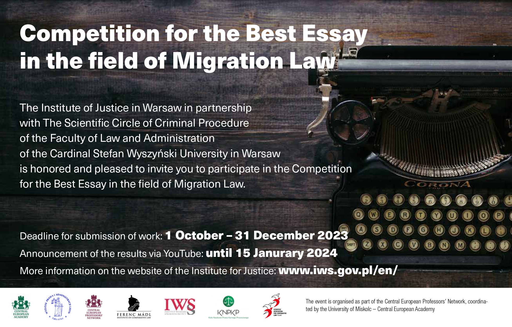 Serdecznie zapraszamy do udziału w konkursie na najlepszą pracę w zakresie prawa migracyjnego organizowanego przez Instytut Wymiaru Sprawiedliwości. Instytut Wymiaru Sprawiedliwości w Warszawie we współpracy z Kołem Naukowym Postępowania Karnego przy Wydziale Prawa i Administracji Uniwersytetu Kardynała Stefana Wyszyńskiego w Warszawie ma zaszczyt i przyjemność zaprosić Państwa do udziału w Konkursie na najlepszy esej z […]