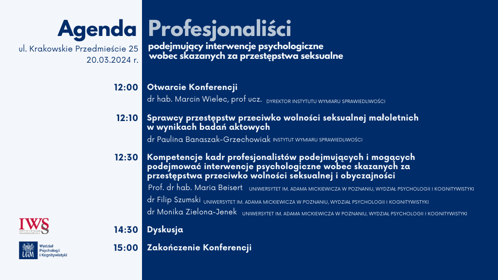 W trakcie panelu naukowego zostaną również omówione badania kompetencji profesjonalnych kadr, które mogą podejmować interwencje psychologiczne wobec skazanych za przestępstwa przeciwko wolności seksualnej i obyczajności. Podczas prezentacji omówione zostaną wyniki oraz wnioski płynące z badania. – Jedynie bieżąca i poparta badaniami wiedza dostarcza narzędzi skutecznej redukcji przestępczości. Jest to szczególnie ważne w obliczu emocji, jakie budzi przestępczość seksualna oraz podejmowania przez niektórych praktyków, przypadkowych i nieudokumentowanych oddziaływań wobec skazanych za przestępstwa przeciwko wolności seksualnej i obyczajności – podkreśla prof. Maria Beisert z Wydziału Psychologii i Kognitywistyki Uniwersytetu im. Adama Mickiewicza w Poznaniu.
